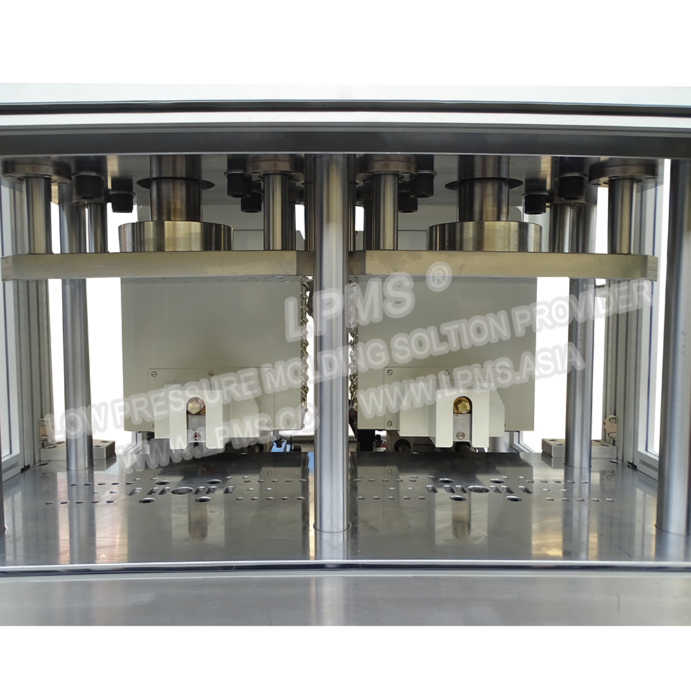 合模采用氣液增壓缸,合模力更大,適合注膠面積較大、注膠量大產品的大批量生產。